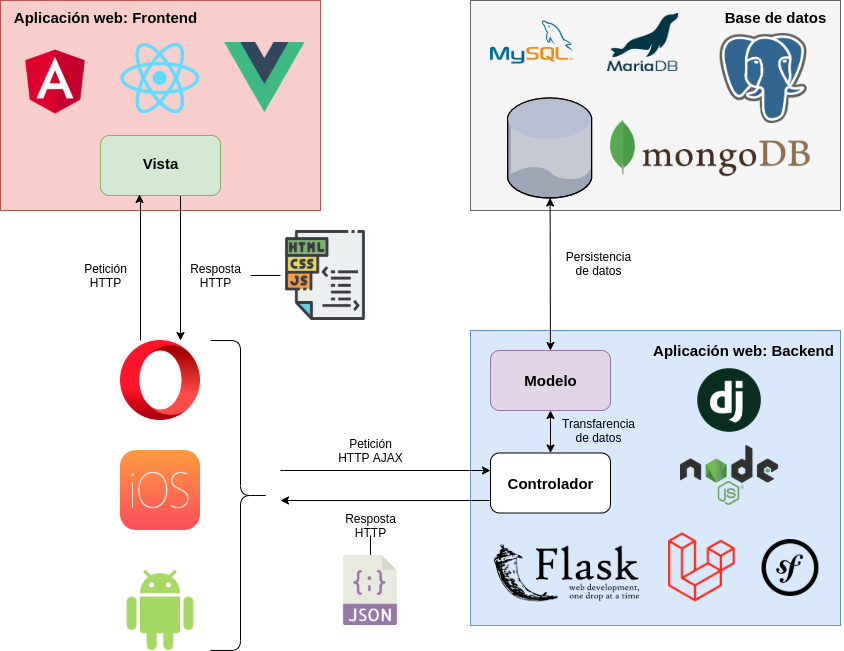 - Comunicación co backend. Para obter ou enviar datos (ex. usuarios, produtos…), o framework fai chamadas HTTP (AJAX) ao backend. O backend responde con datos (JSON) e o framework actualiza a vista en tempo real.