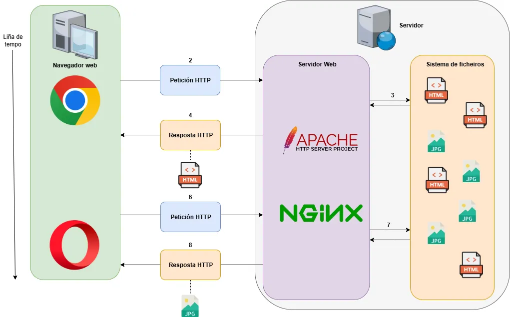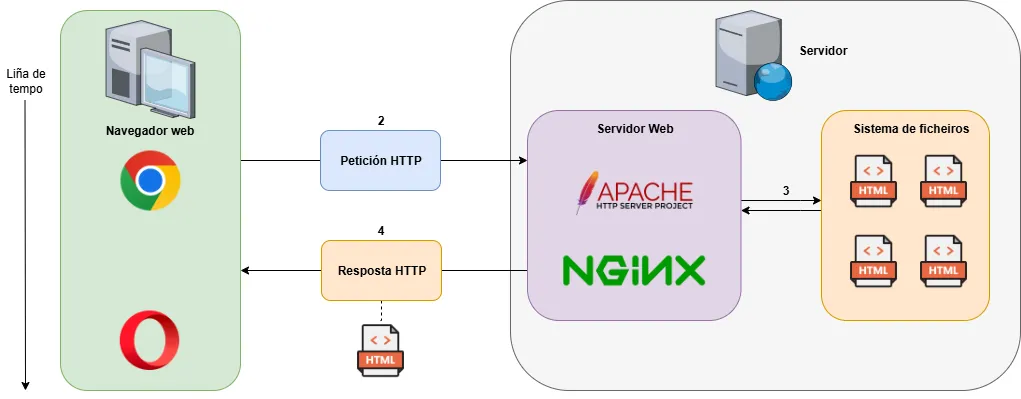 - O servizo web busca no sistema de ficheiros o recurso solicitado, xeralmente un ficheiro HTML.