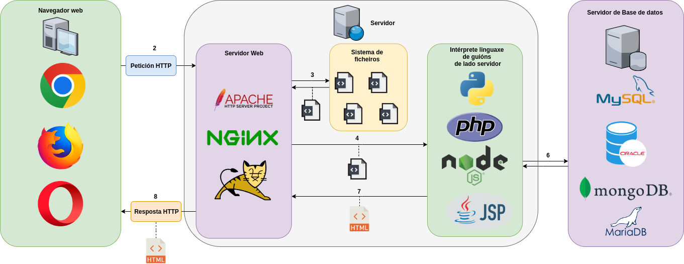 - O usuario a través de un navegador web, ingresa unha URL para realizar unha petición HTTP solicitando un recurso.