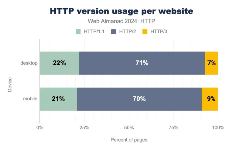 - HTTP/3 (2018): A versión máis recente do protocolo. Modifica o protocolo de transporte de TCP a QUIC (un protocolo basado en UDP). Emprega cifrado obrigatoriamente (TLS 1.3) e reduce a latencia.