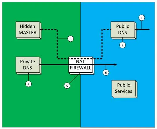 O servidor de nomes privado deberá estar detrás dun firewall para non se permita a resolución de consultas desde Internet. O feito de que un servidor deste tipo sexa invisible cara Internet permite reducir as probabilidades de que sexa atacado desde Internet.