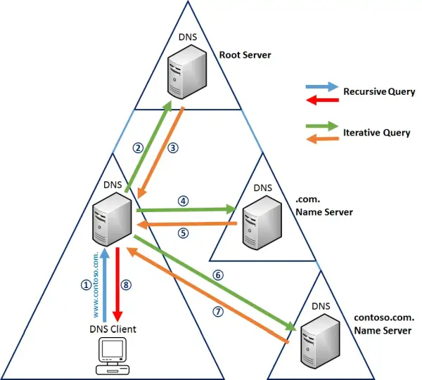 Cando se realiza unha consulta DNS, debemos chegar ata o servidor de autoridade para o dominio que estamos a consultar. Para poder chegar a ese servidor, débese seguir un proceso iterativo, é dicir, de varios pasos.