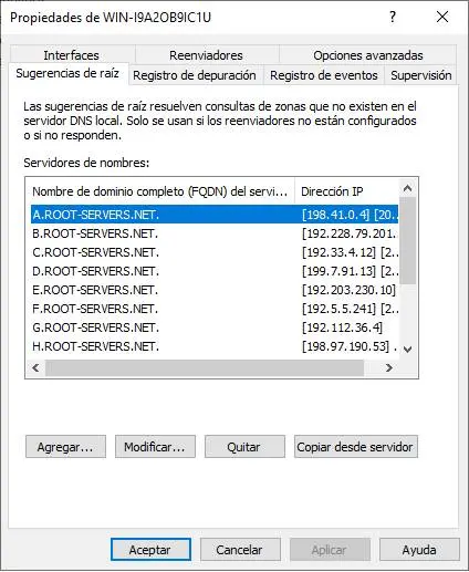 En Windows Server é posible consultar os rexistros na pestaña Sugerencias de raíz das propiedades do servidor DNS: