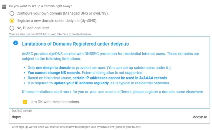 https://desec.io. - Crea unha nova conta. Selecciona a opción Register a new domain under dedyn.io (dynDNS).