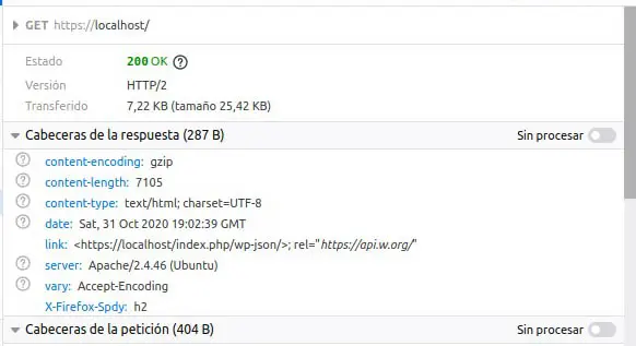 Se abrimos o navegador e accedemos a https://localhost, podemos ver que se está empregando HTTP/2.